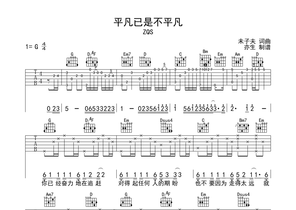 ZQS《平凡已是不平凡》吉他谱 - G调弹唱六线谱