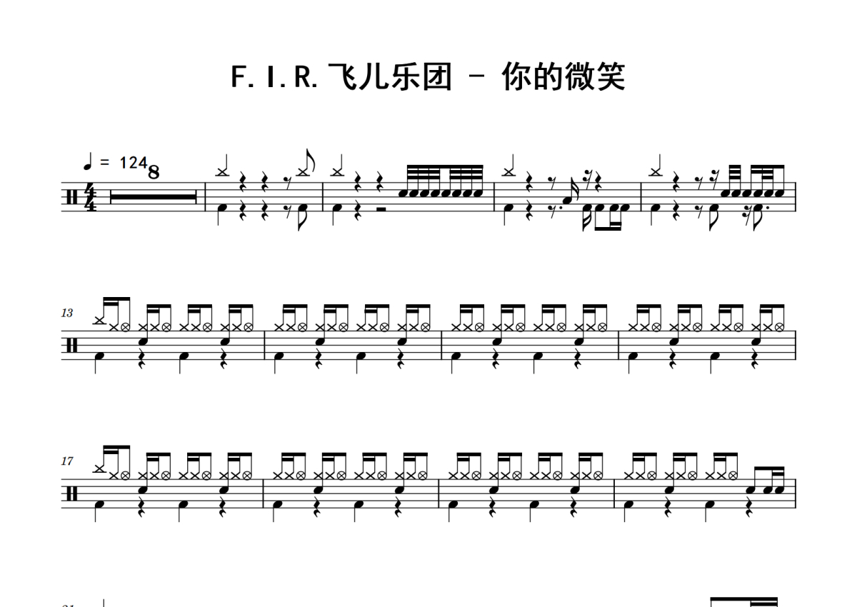 《你的微笑》是飞儿乐团演唱的一首歌曲,拍号为4/4拍,歌曲速度为每分钟124拍,这份鼓谱共有四张高清图谱,图谱由 @老虎不说谎 编配上传,图谱使用五线谱编配,使用这份你的微笑架子鼓谱,你将能够轻松地敲打出这首飞儿乐团的你的微笑,快来尝试吧。