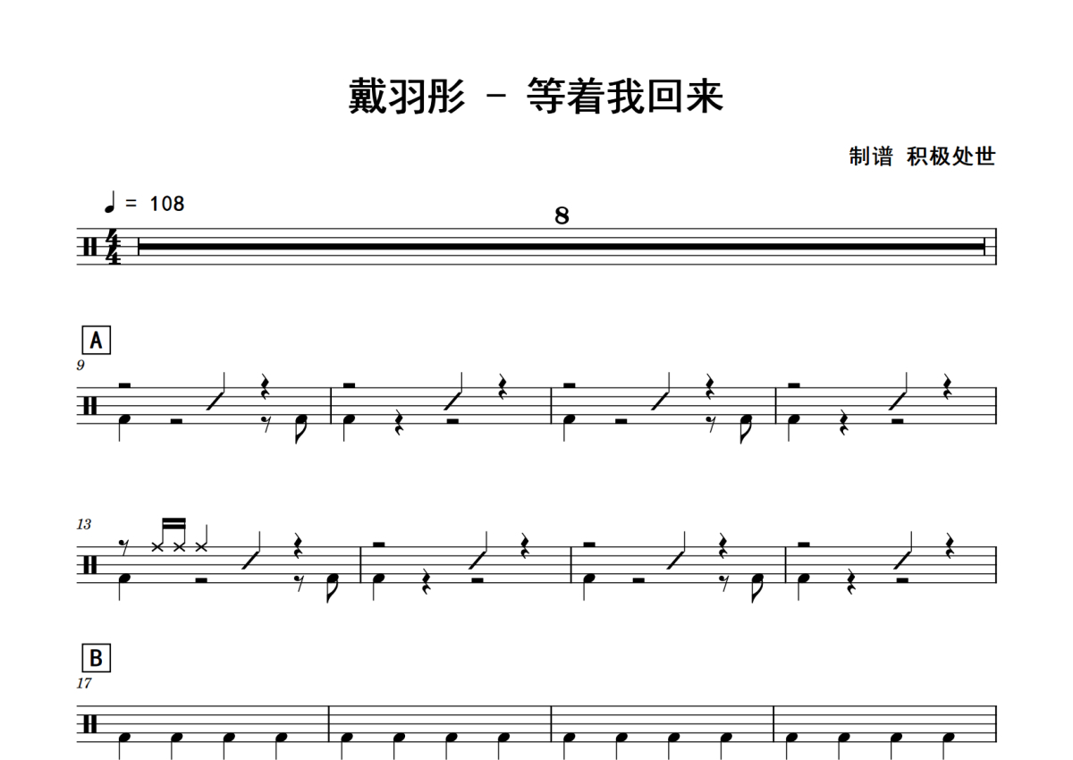 《等着我回来》是戴羽彤演唱的一首歌曲,拍号为4/4拍,歌曲速度为每分钟108拍,这份鼓谱共有两张高清图谱,图谱由 @老虎不说谎 编配上传,图谱使用五线谱编配,使用这份等着我回来架子鼓谱,你将能够轻松地敲打出这首戴羽彤的等着我回来,快来尝试吧。