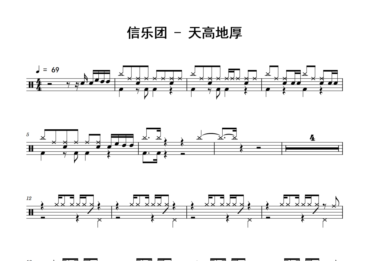 《天高地厚》是信乐团演唱的一首歌曲,拍号为4/4拍,歌曲速度为每分钟69拍,这份鼓谱共有三张高清图谱,图谱由 @老虎不说谎 编配上传,图谱使用五线谱编配,使用这份天高地厚架子鼓谱,你将能够轻松地敲打出这首信乐团的天高地厚,快来尝试吧。