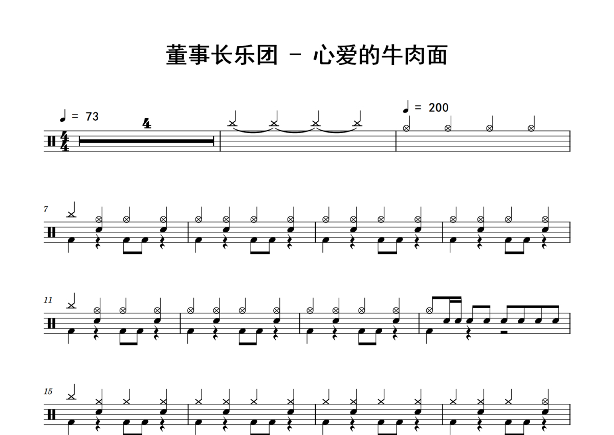 《心爱的牛肉面》是董事长乐团演唱的一首歌曲,拍号为4/4拍,歌曲速度为每分钟73拍,这份鼓谱共有三张高清图谱,图谱由 @老虎不说谎 编配上传,图谱使用五线谱编配,使用这份心爱的牛肉面架子鼓谱,你将能够轻松地敲打出这首董事长乐团的心爱的牛肉面,快来尝试吧。