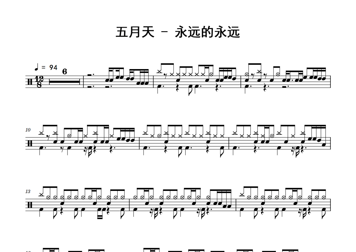 《永远的永远》是五月天演唱的一首歌曲,拍号为4/4拍,歌曲速度为每分钟94拍,这份鼓谱共有三张高清图谱,图谱由 @老虎不说谎 编配上传,图谱使用五线谱编配,使用这份永远的永远架子鼓谱,你将能够轻松地敲打出这首五月天的永远的永远,快来尝试吧。