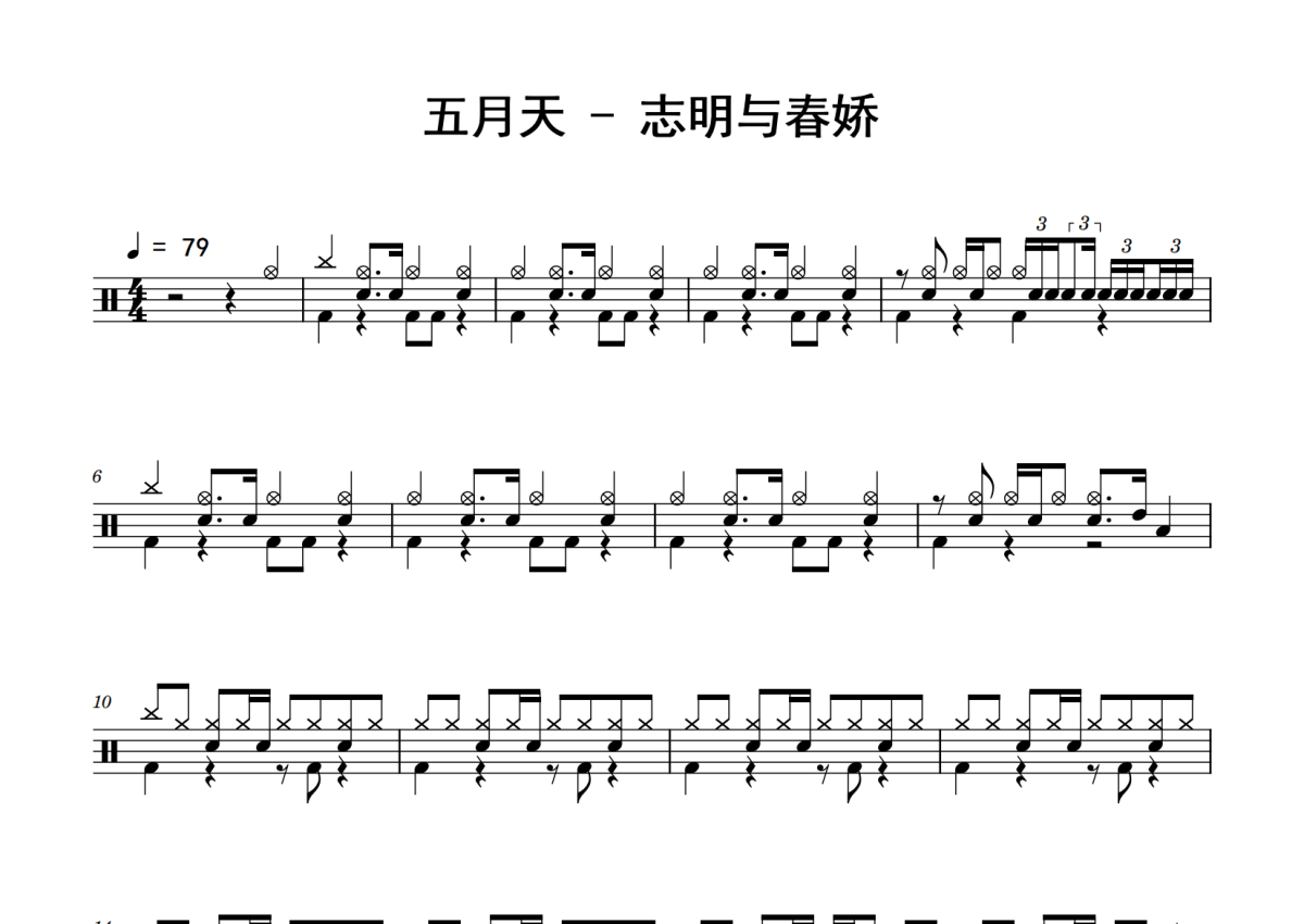 《志明与春娇》是五月天演唱的一首歌曲,拍号为4/4拍,歌曲速度为每分钟79拍,这份鼓谱共有三张高清图谱,图谱由 @老虎不说谎 编配上传,图谱使用五线谱编配,使用这份志明与春娇架子鼓谱,你将能够轻松地敲打出这首五月天的志明与春娇,快来尝试吧。
