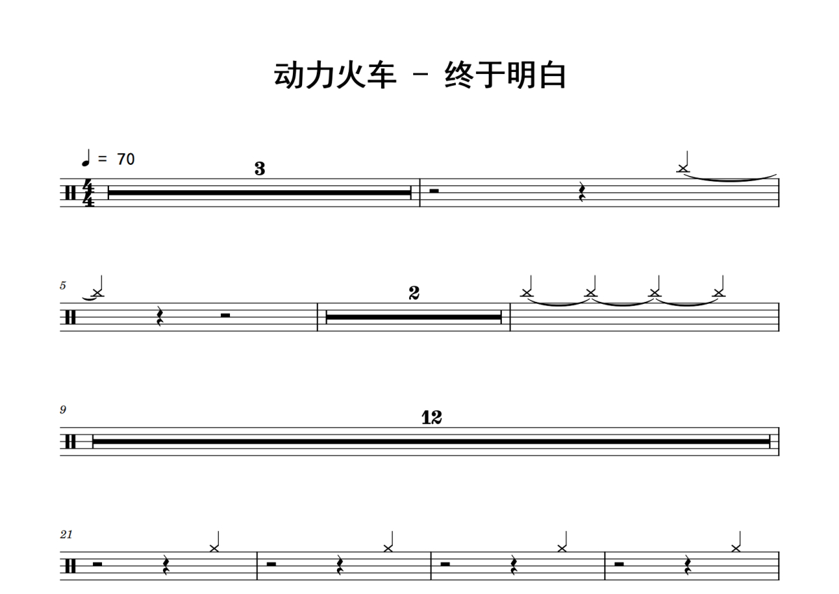 《终于明白》是动力火车演唱的一首歌曲,拍号为4/4拍,歌曲速度为每分钟70拍,这份鼓谱共有两张高清图谱,图谱由 @老虎不说谎 编配上传,图谱使用五线谱编配,使用这份终于明白架子鼓谱,你将能够轻松地敲打出这首动力火车的终于明白,快来尝试吧。