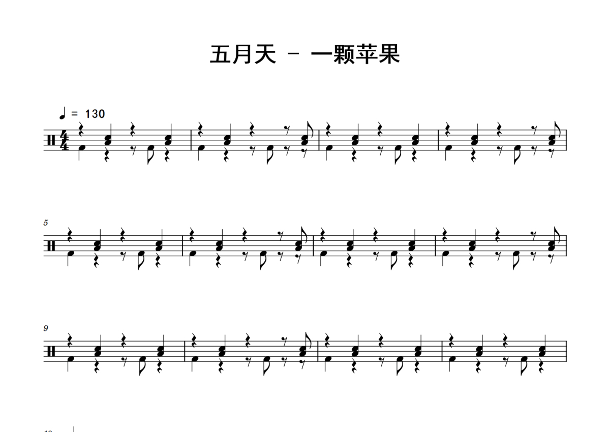 《一颗苹果》是五月天演唱的一首歌曲,拍号为4/4拍,歌曲速度为每分钟130拍,这份鼓谱共有三张高清图谱,图谱由 @老虎不说谎 编配上传,图谱使用五线谱编配,使用这份一颗苹果架子鼓谱,你将能够轻松地敲打出这首五月天的一颗苹果,快来尝试吧。