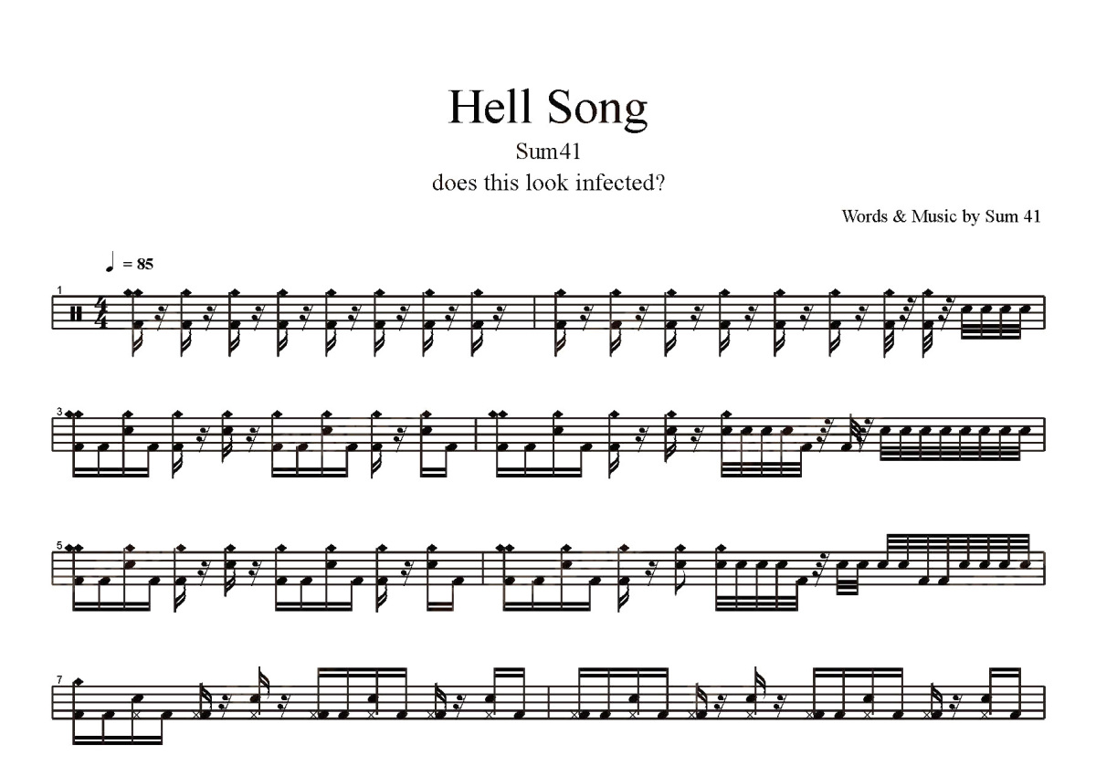 《Hell Song》是Sum 41演唱的一首歌曲,这份鼓谱共有四张高清图谱,图谱由 @打鼓谱 编配上传,图谱使用五线谱编配,使用这份Hell Song架子鼓谱,你将能够轻松地敲打出这首Sum 41的Hell Song,快来尝试吧。《Hell Song》现场版。Sum 41,加拿大流行朋克乐队。该乐队成员包括主唱Deryck Whibley、主音吉他手Dave Baksh、贝斯手Jason McCaslin、吉他手Tom Thacker及鼓手Frank Zummo,于1996年成立。