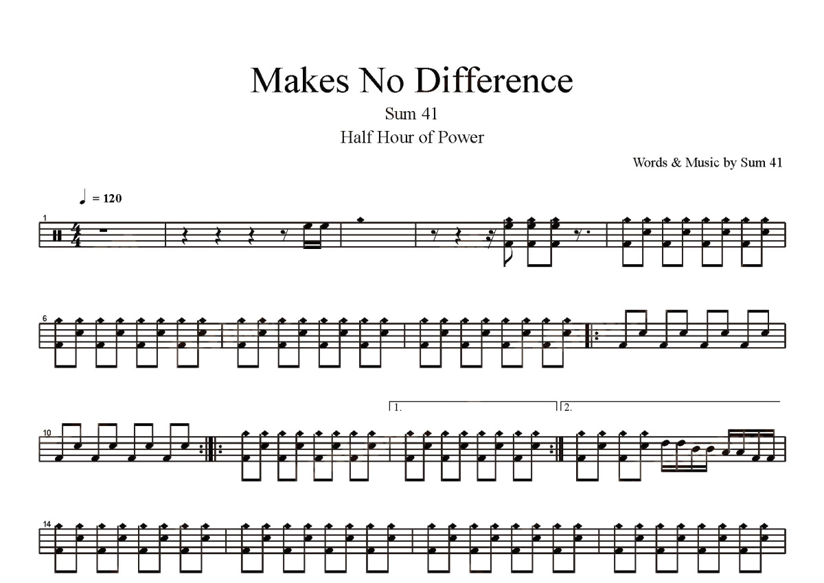 《Makes No Difference》是Sum 41演唱的一首歌曲,这份鼓谱共有两张高清图谱,图谱由 @打鼓谱 编配上传,图谱使用五线谱编配,使用这份Makes No Difference架子鼓谱,你将能够轻松地敲打出这首Sum 41的Makes No Difference,快来尝试吧。《Makes No Difference》是一首由加拿大歌手 Sum 41演唱的英文歌曲,2000年7月27日发行,收录于乐队首张专辑《Half Hour of Power》中。Sum 41,加拿大流行朋克乐队。该乐队成员包括主唱Deryck Whibley、主音吉他手Dave Baksh、贝斯手Jason McCaslin、吉他手Tom Thacker及鼓手Frank Zummo,于1996年成立。