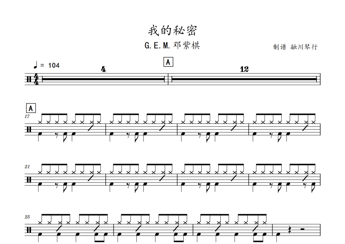 《我的秘密》是邓紫棋演唱的一首歌曲,拍号为4/4拍,歌曲速度为每分钟104拍,这份鼓谱共有三张高清图谱,图谱由 @老虎不说谎 编配上传,图谱使用五线谱编配,使用这份我的秘密架子鼓谱,你将能够轻松地敲打出这首邓紫棋的我的秘密,快来尝试吧。