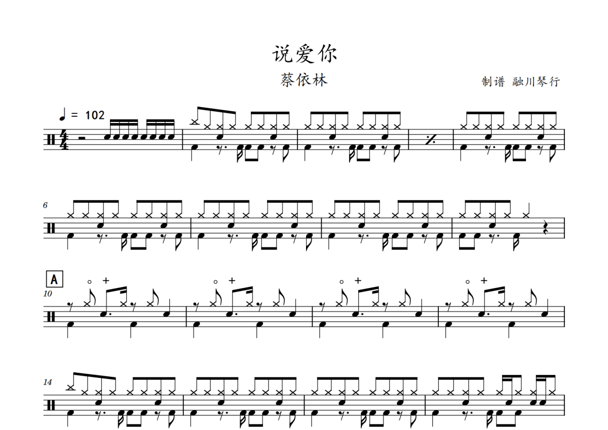 《说爱你》是蔡依林演唱的一首歌曲,拍号为4/4拍,歌曲速度为每分钟102拍,这份鼓谱共有两张高清图谱,图谱由 @老虎不说谎 编配上传,图谱使用五线谱编配,使用这份说爱你架子鼓谱,你将能够轻松地敲打出这首蔡依林的说爱你,快来尝试吧。