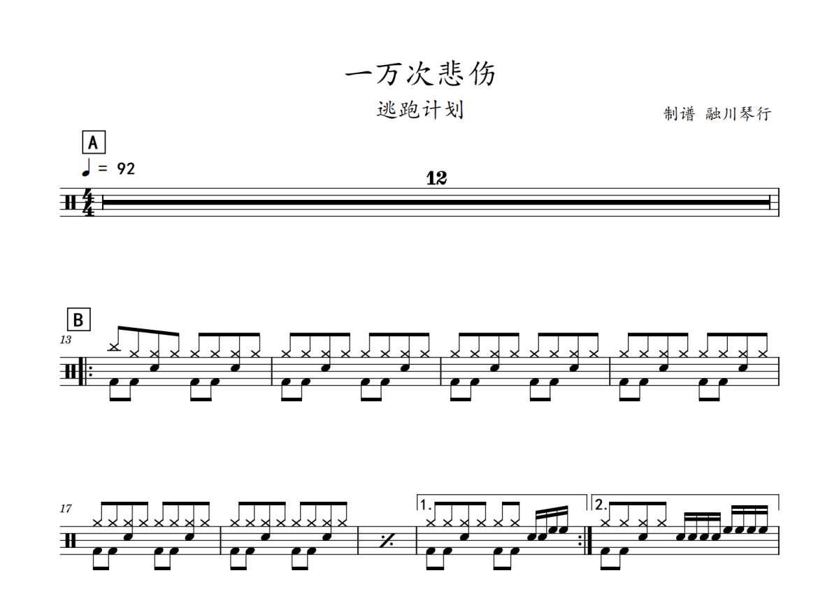 《一万次悲伤》是逃跑计划演唱的一首歌曲,拍号为4/4拍,歌曲速度为每分钟92拍,这份鼓谱共有两张高清图谱,图谱由 @老虎不说谎 编配上传,图谱使用五线谱编配,使用这份一万次悲伤架子鼓谱,你将能够轻松地敲打出这首逃跑计划的一万次悲伤,快来尝试吧。