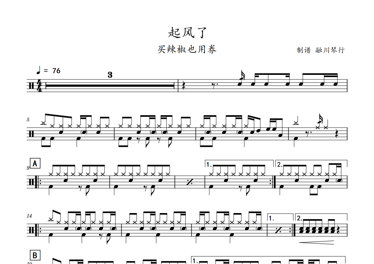 《起风了》是买辣椒也用券演唱的一首歌曲,拍号为4/4拍,歌曲速度为每分钟76拍,这份鼓谱共有两张高清图谱,图谱由 @老虎不说谎 编配上传,图谱使用五线谱编配,使用这份起风了架子鼓谱,你将能够轻松地敲打出这首买辣椒也用券的起风了,快来尝试吧。