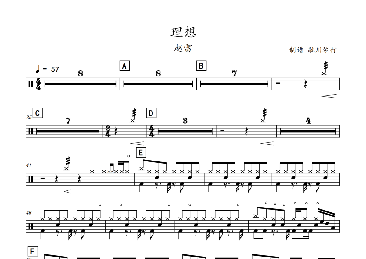 《理想》是赵雷演唱的一首歌曲,拍号为4/4拍,歌曲速度为每分钟57拍,这份鼓谱共有一张高清图谱,图谱由 @老虎不说谎 编配上传,图谱使用五线谱编配,使用这份理想架子鼓谱,你将能够轻松地敲打出这首赵雷的理想,快来尝试吧。