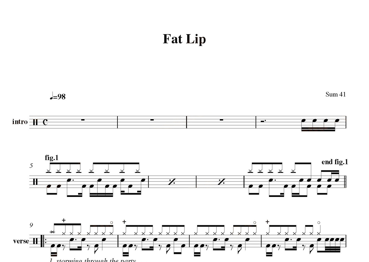 《Fat Lip》是Sum41演唱的一首歌曲,这份鼓谱共有两张高清图谱,图谱由 @打鼓谱 编配上传,图谱使用五线谱编配,使用这份Fat Lip架子鼓谱,你将能够轻松地敲打出这首Sum41的Fat Lip,快来尝试吧。《Fat Lip》是Sum 41演唱的一首歌曲,收录于2001年发行的《All Killer No Filler》专辑中。Sum 41,加拿大流行朋克乐队。该乐队成员包括主唱Deryck Whibley、主音吉他手Dave Baksh、贝斯手Jason McCaslin、吉他手Tom Thacker及鼓手Frank Zummo,于1996年成立。