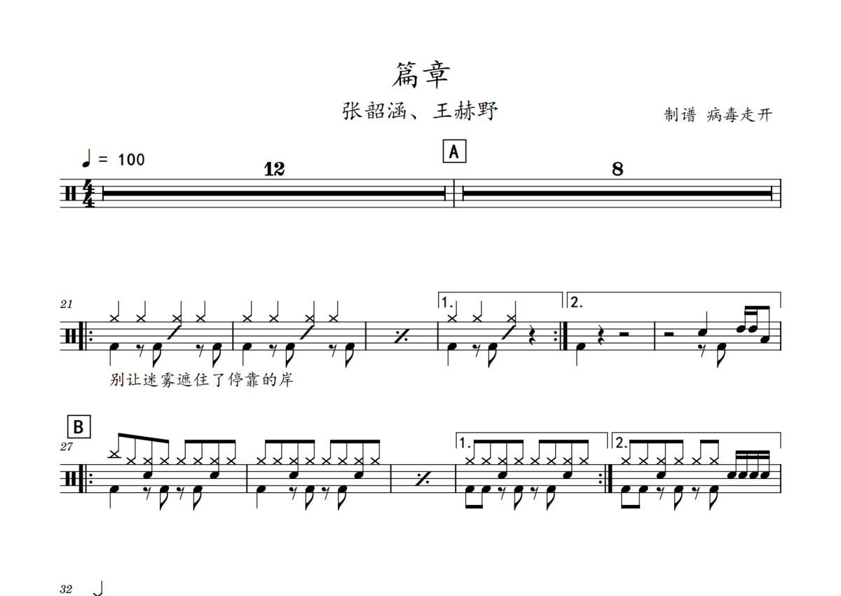 《篇章》是张韶涵演唱的一首歌曲,初级,歌曲速度为每分钟100拍,这份鼓谱共有两张高清图谱,图谱由 @老虎不说谎 编配上传,图谱使用五线谱编配,使用这份篇章架子鼓谱,你将能够轻松地敲打出这首张韶涵的篇章,快来尝试吧。