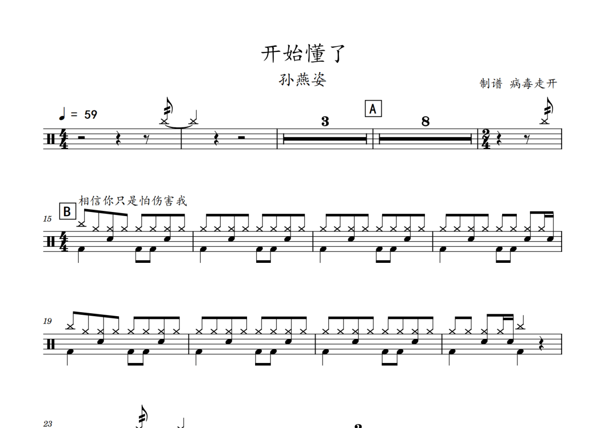 《开始懂了》是孙燕姿演唱的一首歌曲,拍号为4/4拍,歌曲速度为每分钟59拍,这份鼓谱共有两张高清图谱,图谱由 @老虎不说谎 编配上传,图谱使用五线谱编配,使用这份开始懂了架子鼓谱,你将能够轻松地敲打出这首孙燕姿的开始懂了,快来尝试吧。