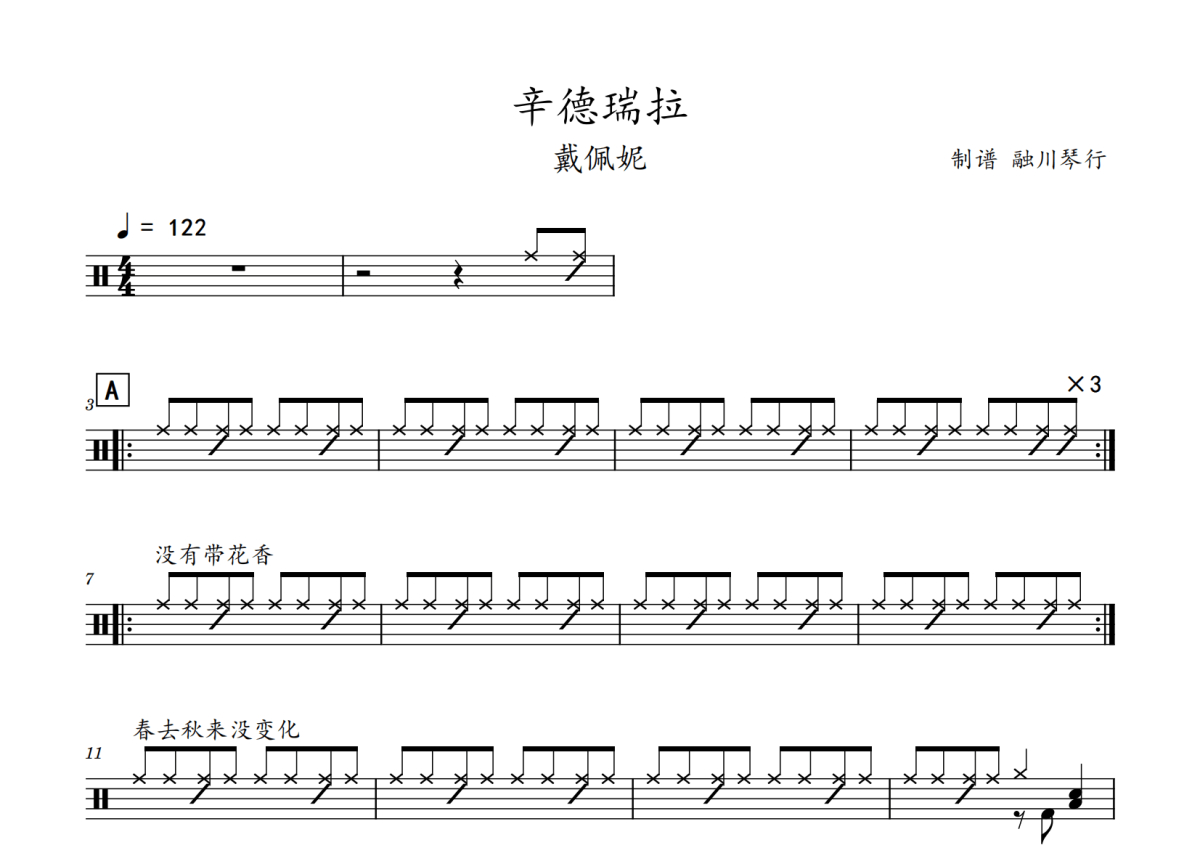 《辛德瑞拉》是戴佩妮演唱的一首歌曲,拍号为4/4拍,歌曲速度为每分钟122拍,这份鼓谱共有三张高清图谱,图谱由 @老虎不说谎 编配上传,图谱使用五线谱编配,使用这份辛德瑞拉架子鼓谱,你将能够轻松地敲打出这首戴佩妮的辛德瑞拉,快来尝试吧。