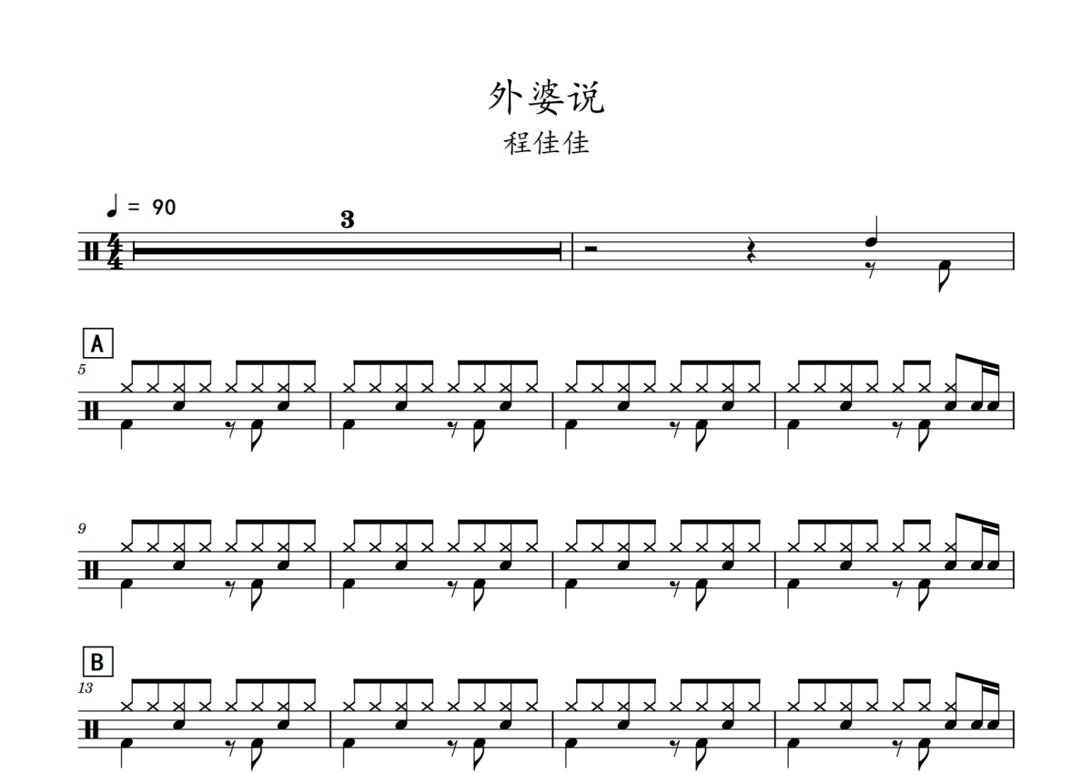 《外婆说》是程jiajia演唱的一首歌曲,拍号为4/4拍,歌曲速度为每分钟90拍,这份鼓谱共有两张高清图谱,图谱由 @老虎不说谎 编配上传,图谱使用五线谱编配,使用这份外婆说架子鼓谱,你将能够轻松地敲打出这首程jiajia的外婆说,快来尝试吧。