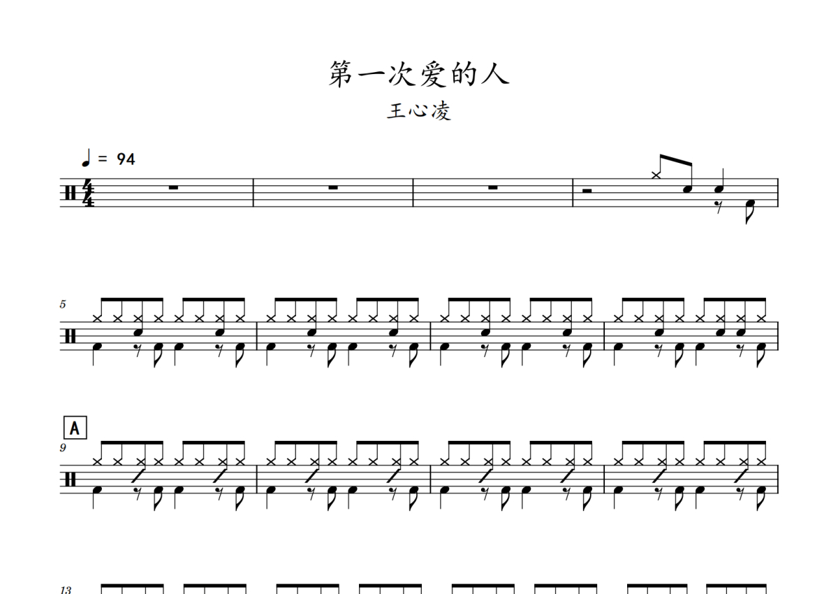 《第一次爱的人》是王心凌演唱的一首歌曲,拍号为4/4拍,歌曲速度为每分钟94拍,这份鼓谱共有三张高清图谱,图谱由 @老虎不说谎 编配上传,图谱使用五线谱编配,使用这份第一次爱的人架子鼓谱,你将能够轻松地敲打出这首王心凌的第一次爱的人,快来尝试吧。