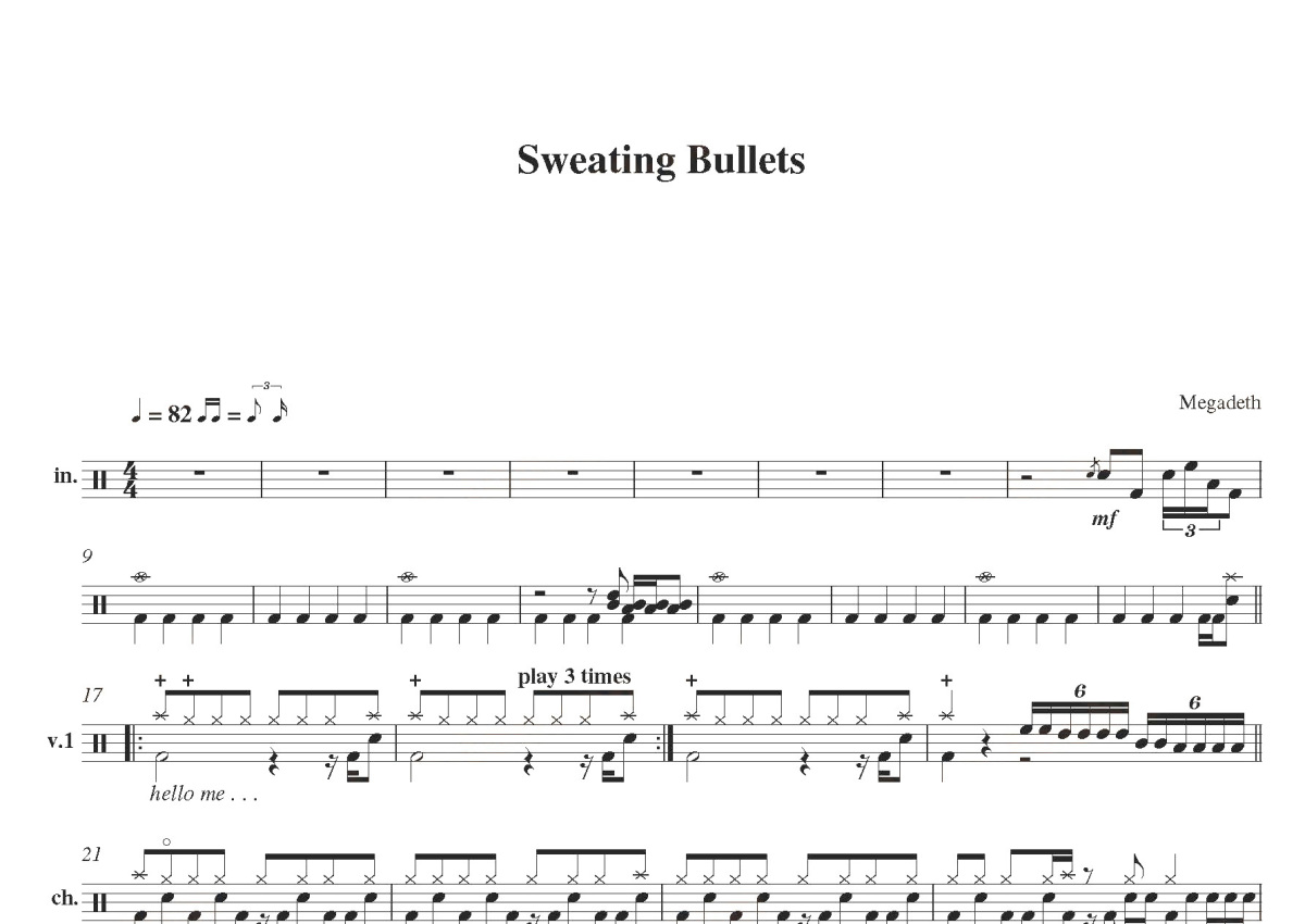 《sweating bullets》是Megadeth演唱的一首歌曲,这份鼓谱共有两张高清图谱,图谱由 @打鼓谱 编配上传,图谱使用五线谱编配,使用这份sweating bullets架子鼓谱,你将能够轻松地敲打出这首Megadeth的sweating bullets,快来尝试吧。“发汗的子弹”是美国重金属乐队Megadeth的一首歌。它于1993年发行,是他们第五张专辑Countdown to Extinction的第三张单曲。这首歌的音乐录影带由韦恩·伊舍姆(Wayne Isham)导演。这首歌在美国主流摇滚排行榜上排名第27位,在英国排行榜上排名第26位。