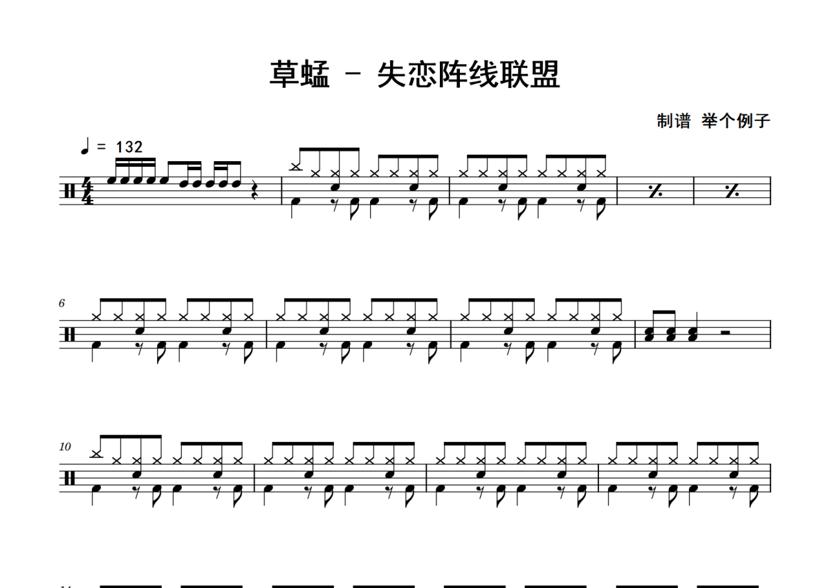 《失恋阵线联盟》是草蜢乐队演唱的一首歌曲,拍号为4/4拍,歌曲速度为每分钟132拍,这份鼓谱共有三张高清图谱,图谱由 @老虎不说谎 编配上传,图谱使用五线谱编配,使用这份失恋阵线联盟架子鼓谱,你将能够轻松地敲打出这首草蜢乐队的失恋阵线联盟,快来尝试吧。