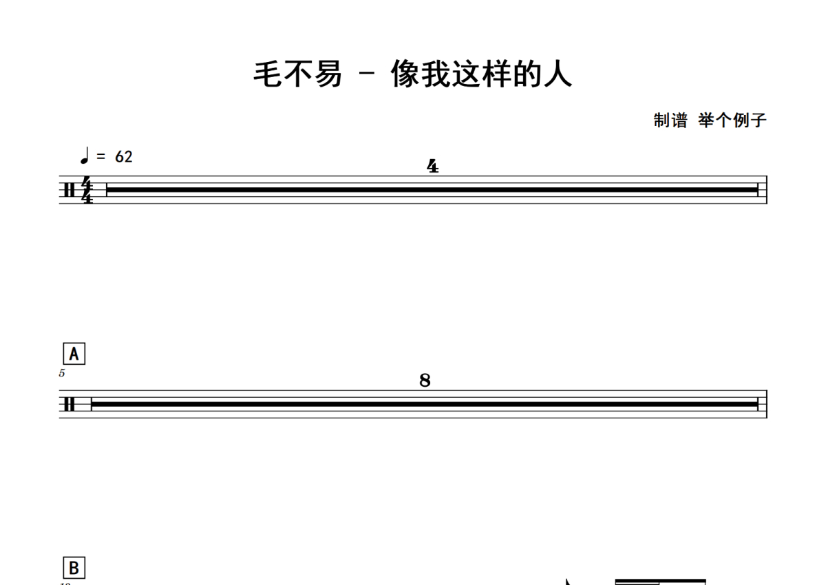 《像我这样的人》是毛不易演唱的一首歌曲,拍号为4/4拍,歌曲速度为每分钟62拍,这份鼓谱共有两张高清图谱,图谱由 @老虎不说谎 编配上传,图谱使用五线谱编配,使用这份像我这样的人架子鼓谱,你将能够轻松地敲打出这首毛不易的像我这样的人,快来尝试吧。