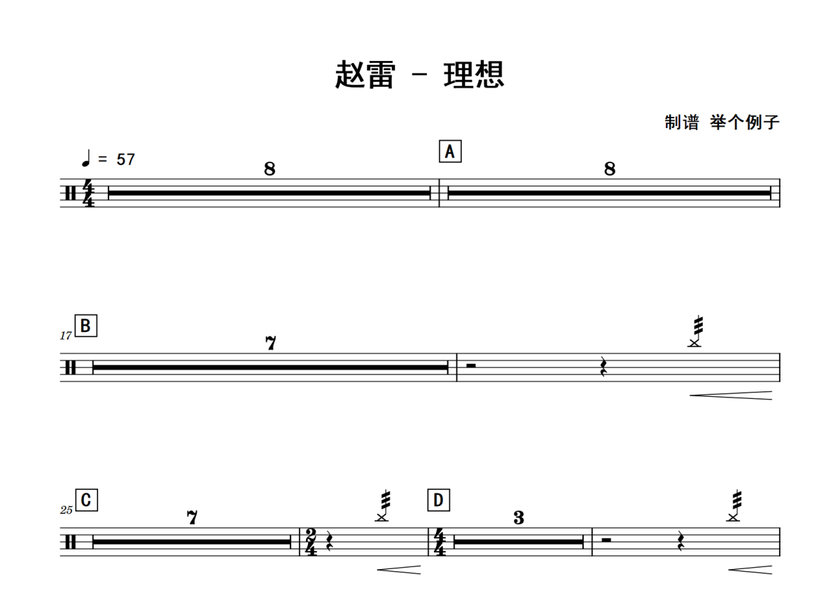 《理想》是赵雷演唱的一首歌曲,拍号为4/4拍,歌曲速度为每分钟57拍,这份鼓谱共有两张高清图谱,图谱由 @老虎不说谎 编配上传,图谱使用五线谱编配,使用这份理想架子鼓谱,你将能够轻松地敲打出这首赵雷的理想,快来尝试吧。