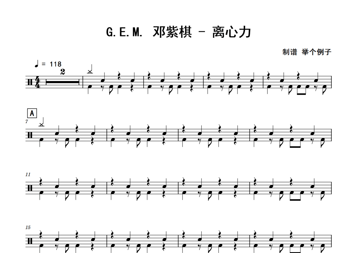 《离心力》是邓紫棋演唱的一首歌曲,拍号为4/4拍,歌曲速度为每分钟118拍,这份鼓谱共有三张高清图谱,图谱由 @老虎不说谎 编配上传,图谱使用五线谱编配,使用这份离心力架子鼓谱,你将能够轻松地敲打出这首邓紫棋的离心力,快来尝试吧。