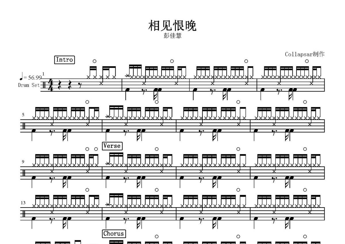 《相见恨晚》是彭佳慧演唱的一首歌曲,这份鼓谱共有两张高清图谱,图谱由 @打鼓谱 编配上传,图谱使用五线谱编配,使用这份相见恨晚架子鼓谱,你将能够轻松地敲打出这首彭佳慧的相见恨晚,快来尝试吧。《相见恨晚》这首歌由娃娃写词,陈国华作曲,分别收录在彭佳慧《敲敲我的头》和高胜美《刻骨铭心》。由贝塔斯曼唱片公司发行于1998年8月,收录在彭佳慧的专辑《敲敲我的头》中,是一首激情励志、波动情感的伤感情歌,曾在港台和大陆乃至东南亚范围内引起一时的轰动,获取新加坡最受欢迎女歌手奖,是彭佳慧歌唱生涯里的一首著名的情歌。