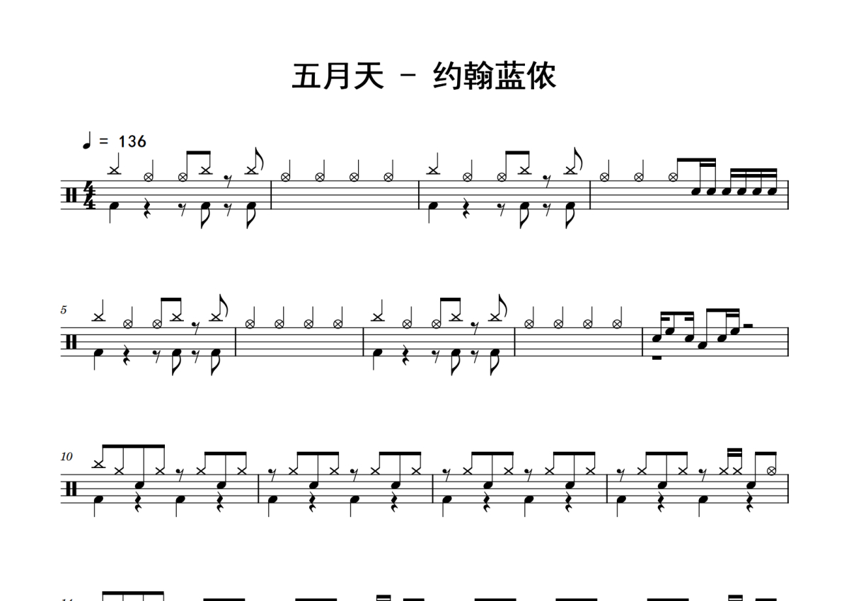 《约翰蓝侬》是五月天演唱的一首歌曲,拍号为4/4拍,歌曲速度为每分钟136拍,这份鼓谱共有四张高清图谱,图谱由 @老虎不说谎 编配上传,图谱使用五线谱编配,使用这份约翰蓝侬架子鼓谱,你将能够轻松地敲打出这首五月天的约翰蓝侬,快来尝试吧。