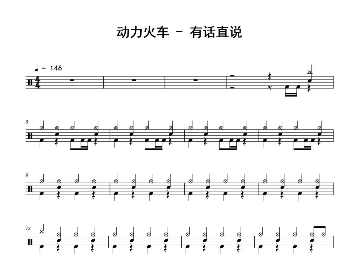 《有话直说》是动力火车演唱的一首歌曲,拍号为4/4拍,歌曲速度为每分钟146拍,这份鼓谱共有四张高清图谱,图谱由 @老虎不说谎 编配上传,图谱使用五线谱编配,使用这份有话直说架子鼓谱,你将能够轻松地敲打出这首动力火车的有话直说,快来尝试吧。