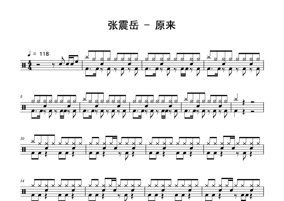 《原来》是张震岳演唱的一首歌曲,拍号为4/4拍,歌曲速度为每分钟118拍,这份鼓谱共有五张高清图谱,图谱由 @老虎不说谎 编配上传,图谱使用五线谱编配,使用这份原来架子鼓谱,你将能够轻松地敲打出这首张震岳的原来,快来尝试吧。