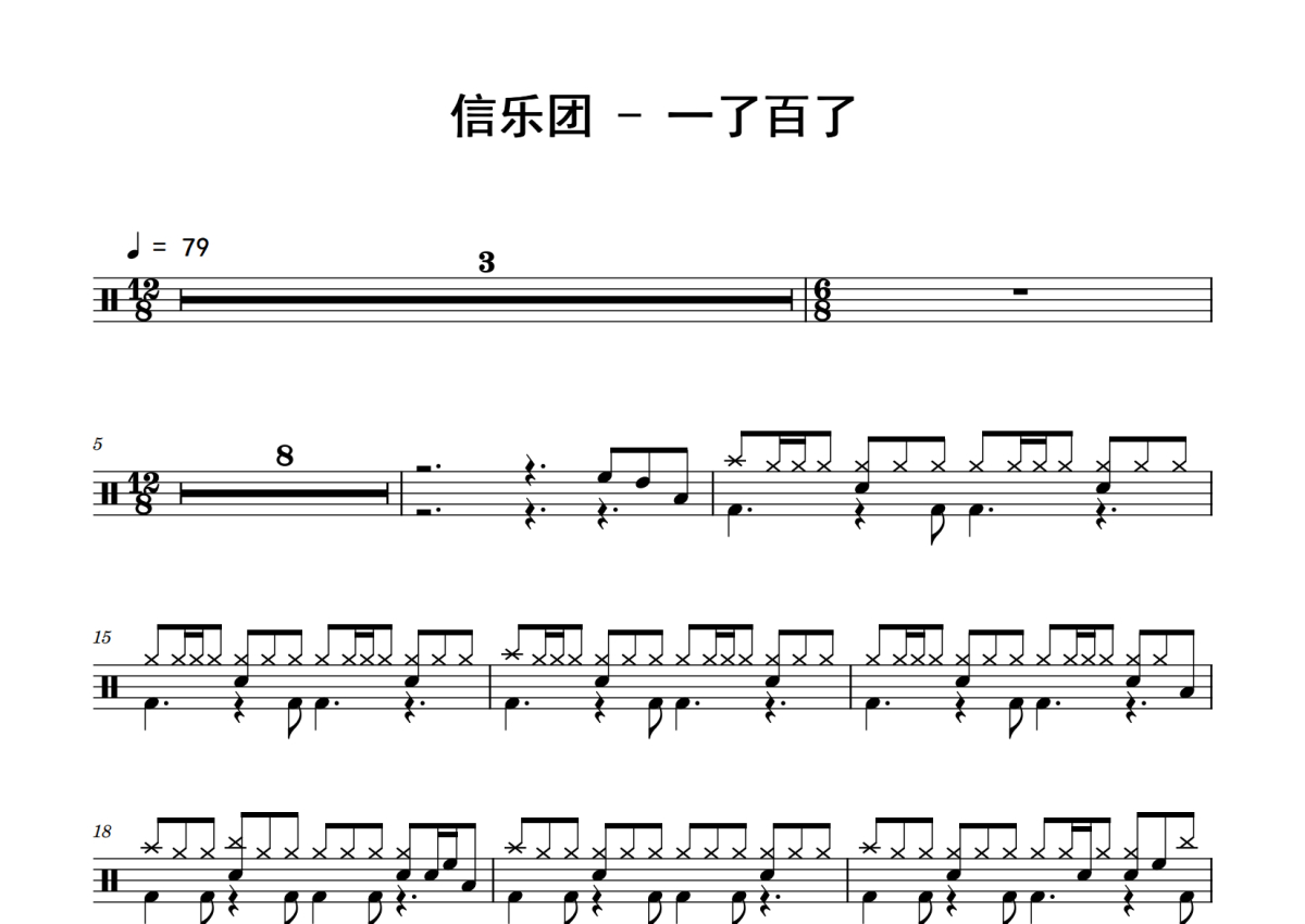 《一了百了》是信乐团演唱的一首歌曲,拍号为4/4拍,歌曲速度为每分钟79拍,这份鼓谱共有两张高清图谱,图谱由 @老虎不说谎 编配上传,图谱使用五线谱编配,使用这份一了百了架子鼓谱,你将能够轻松地敲打出这首信乐团的一了百了,快来尝试吧。