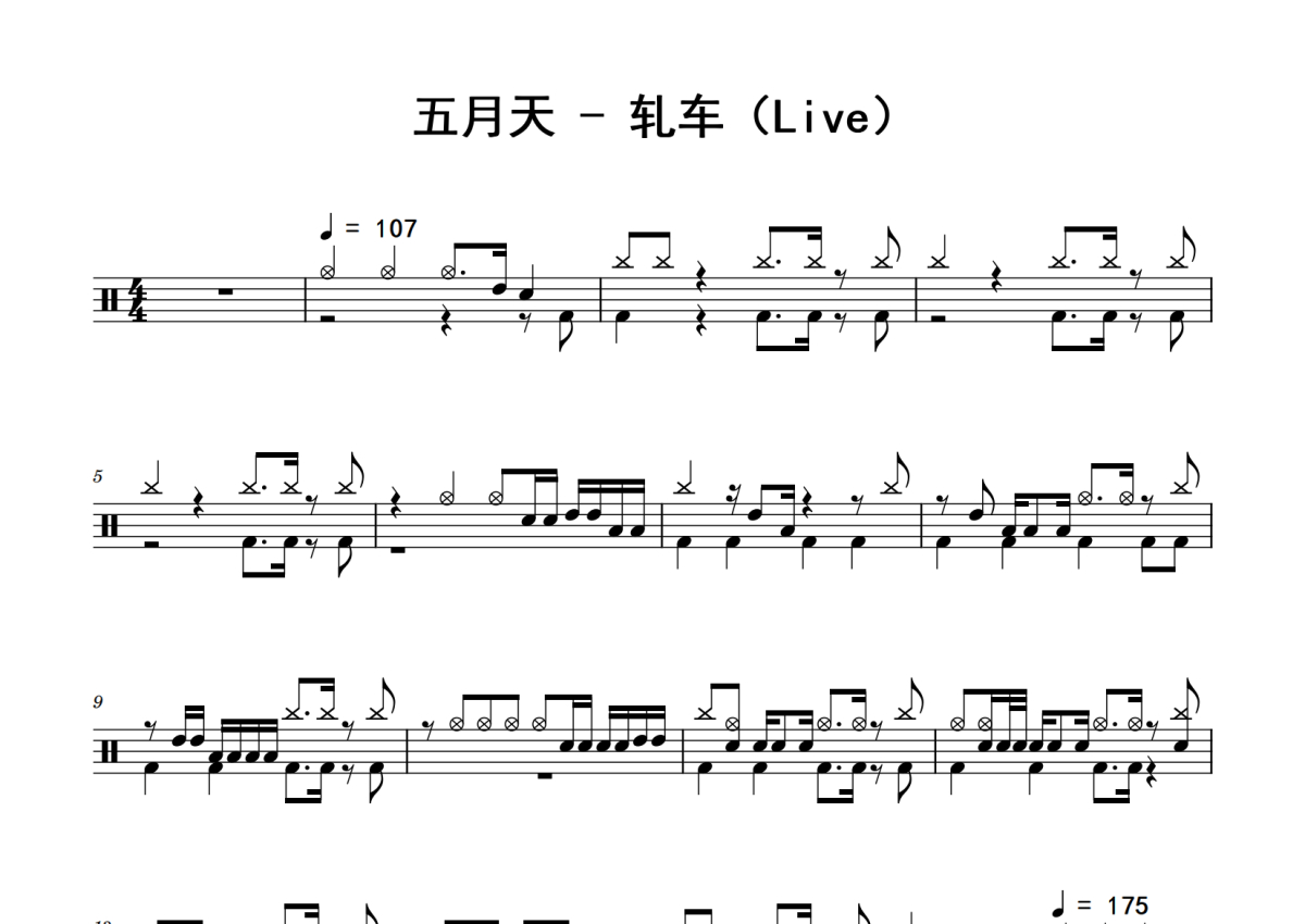 《轧车》是五月天演唱的一首歌曲,Live,拍号为4/4拍,歌曲速度为每分钟107拍,这份鼓谱共有四张高清图谱,图谱由 @老虎不说谎 编配上传,图谱使用五线谱编配,使用这份轧车架子鼓谱,你将能够轻松地敲打出这首五月天的轧车,快来尝试吧。