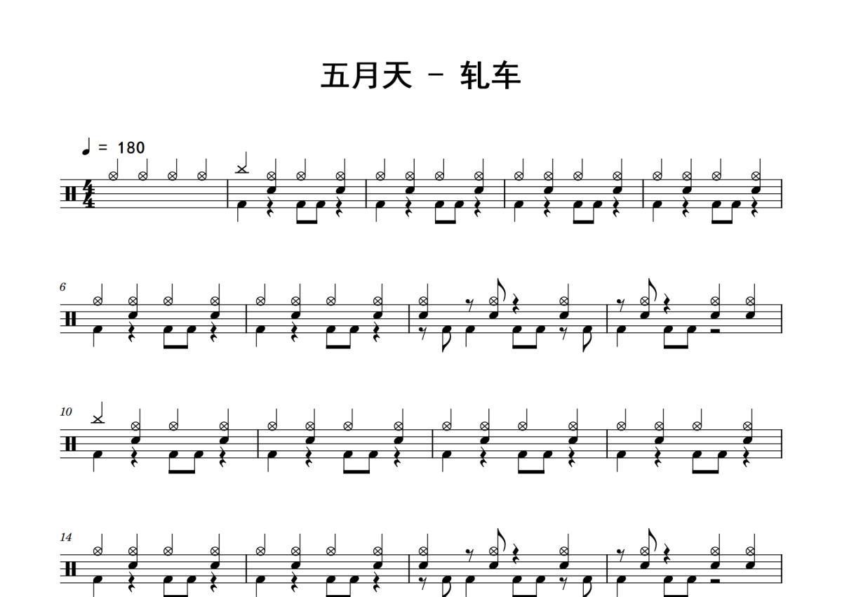 《轧车》是五月天演唱的一首歌曲,拍号为4/4拍,歌曲速度为每分钟180拍,这份鼓谱共有三张高清图谱,图谱由 @老虎不说谎 编配上传,图谱使用五线谱编配,使用这份轧车架子鼓谱,你将能够轻松地敲打出这首五月天的轧车,快来尝试吧。