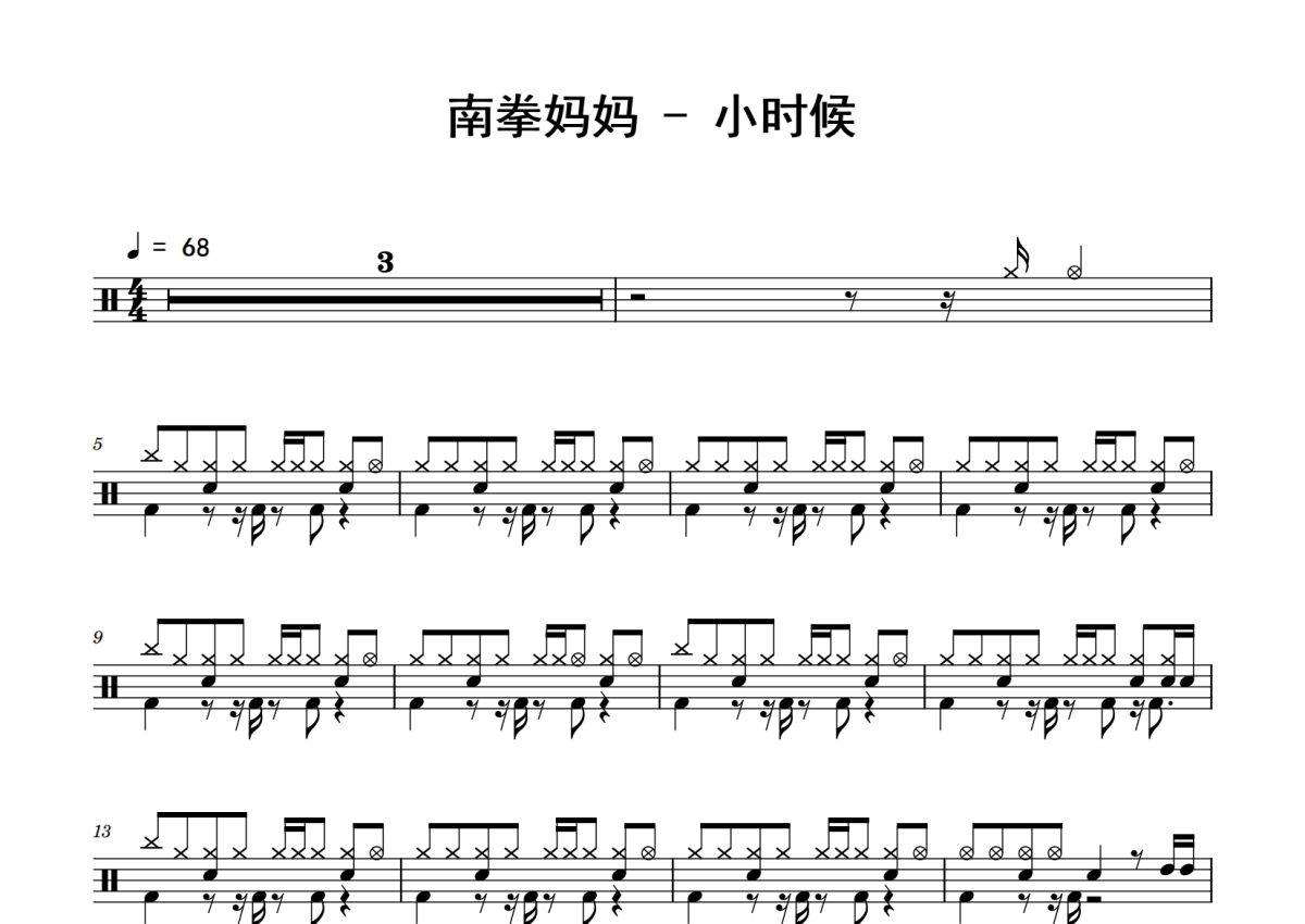 《小时候》是南拳妈妈演唱的一首歌曲,拍号为4/4拍,歌曲速度为每分钟68拍,这份鼓谱共有两张高清图谱,图谱由 @老虎不说谎 编配上传,图谱使用五线谱编配,使用这份小时候架子鼓谱,你将能够轻松地敲打出这首南拳妈妈的小时候,快来尝试吧。