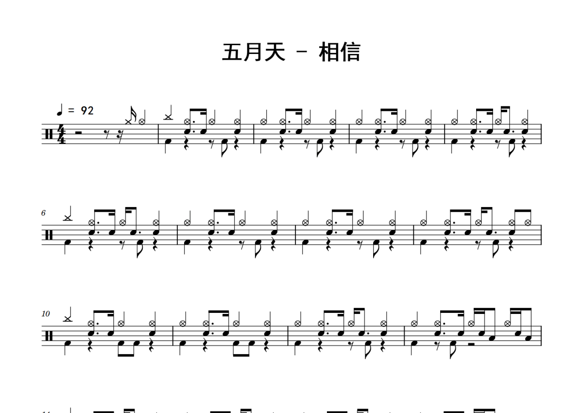 《相信》是五月天演唱的一首歌曲,拍号为4/4拍,歌曲速度为每分钟92拍,这份鼓谱共有四张高清图谱,图谱由 @老虎不说谎 编配上传,图谱使用五线谱编配,使用这份相信架子鼓谱,你将能够轻松地敲打出这首五月天的相信,快来尝试吧。