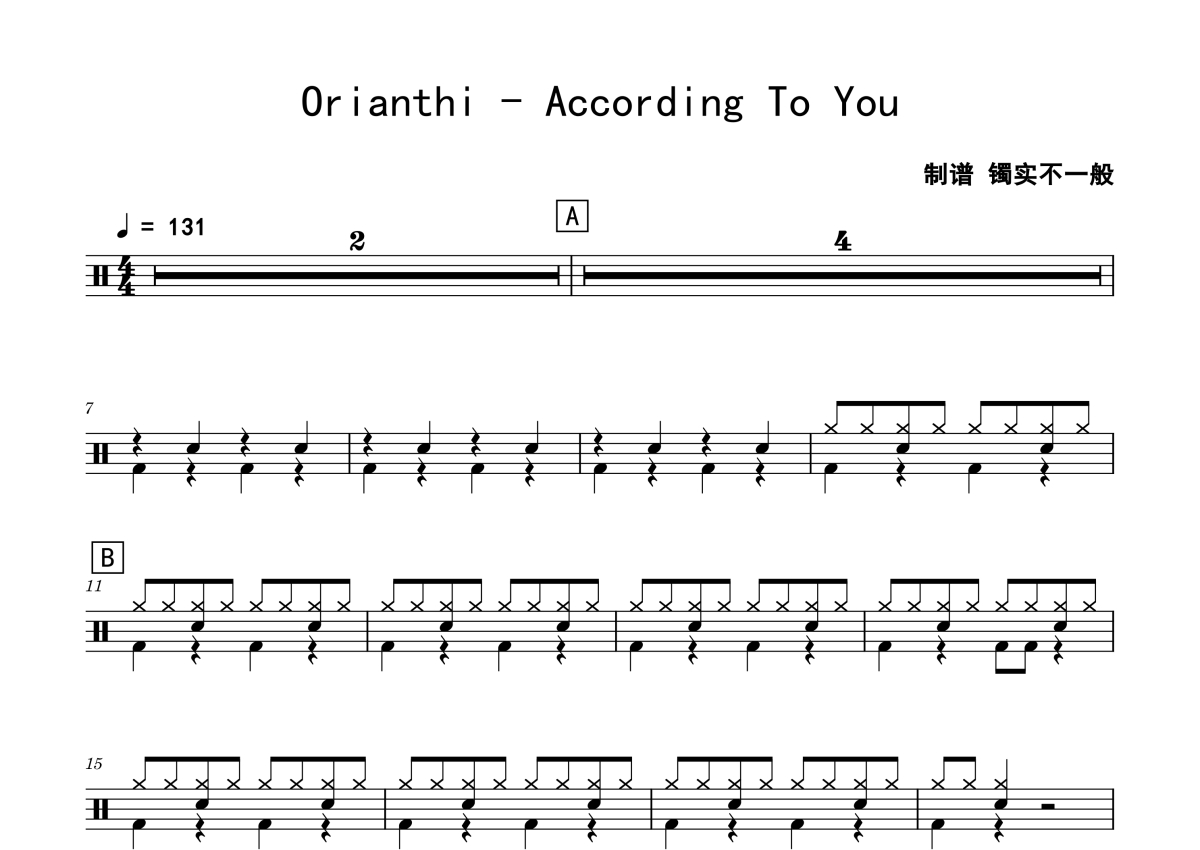 《According To You》是Orianthi演唱的一首歌曲,拍号为4/4拍,歌曲速度为每分钟131拍,这份鼓谱共有三张高清图谱,图谱由 @老虎不说谎 编配上传,图谱使用五线谱编配,使用这份According To You架子鼓谱,你将能够轻松地敲打出这首Orianthi的According To You,快来尝试吧。