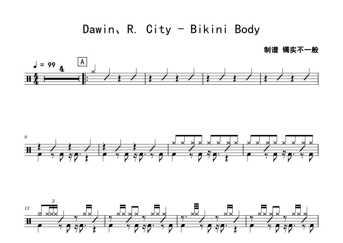 《Bikini Body》是Dawin、R. City演唱的一首歌曲,拍号为4/4拍,歌曲速度为每分钟99拍,这份鼓谱共有两张高清图谱,图谱由 @老虎不说谎 编配上传,图谱使用五线谱编配,使用这份Bikini Body架子鼓谱,你将能够轻松地敲打出这首Dawin、R. City的Bikini Body,快来尝试吧。