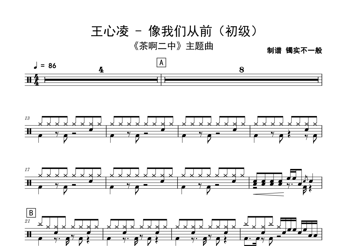 《像我们从前》是王心凌演唱的一首歌曲,初级,拍号为4/4拍,歌曲速度为每分钟86拍,这份鼓谱共有两张高清图谱,图谱由 @老虎不说谎 编配上传,图谱使用五线谱编配,使用这份像我们从前架子鼓谱,你将能够轻松地敲打出这首王心凌的像我们从前,快来尝试吧。