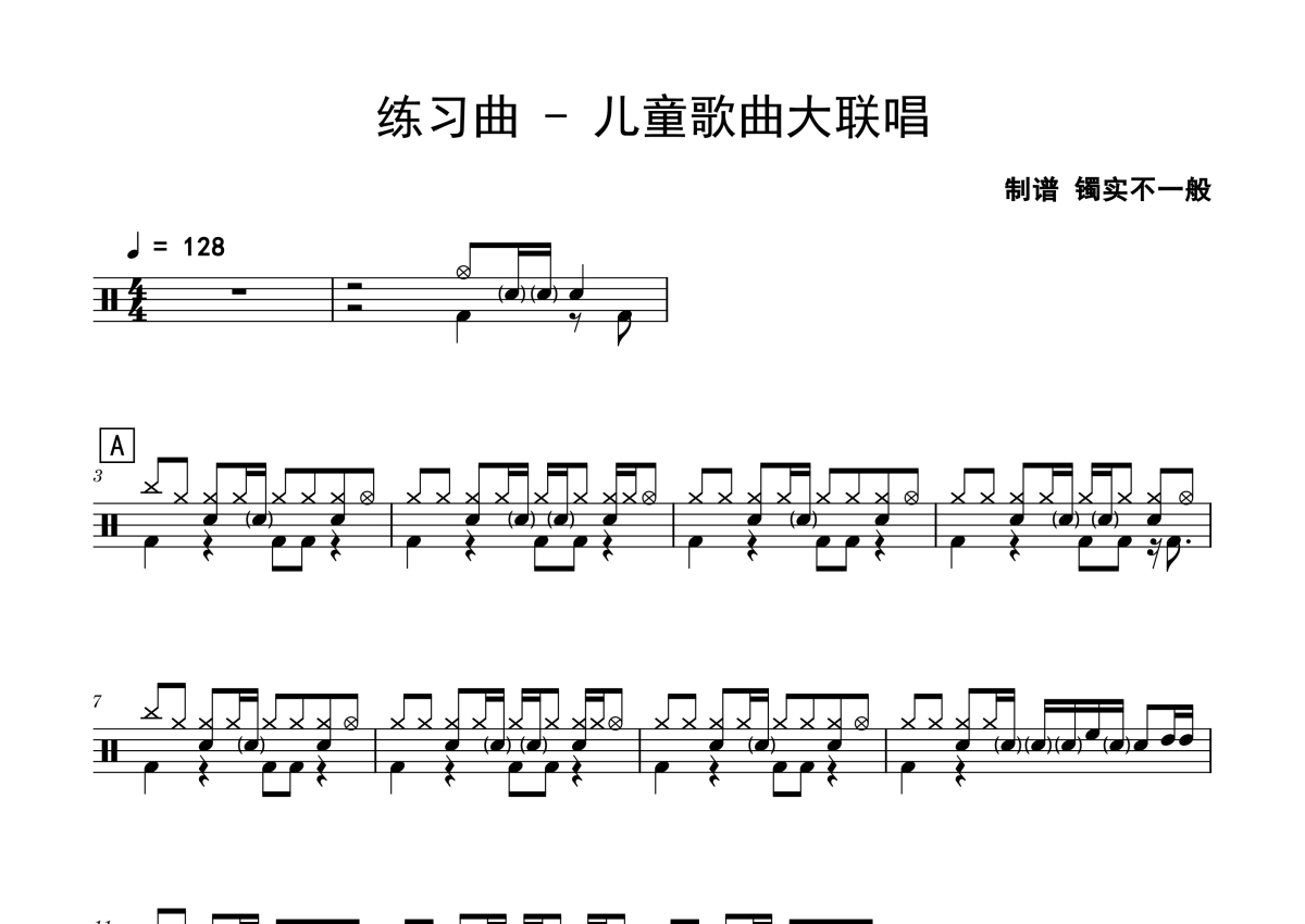 《儿童歌曲大联唱》是练习曲演唱的一首歌曲,拍号为4/4拍,歌曲速度为每分钟128拍,这份鼓谱共有四张高清图谱,图谱由 @老虎不说谎 编配上传,图谱使用五线谱编配,使用这份儿童歌曲大联唱架子鼓谱,你将能够轻松地敲打出这首练习曲的儿童歌曲大联唱,快来尝试吧。