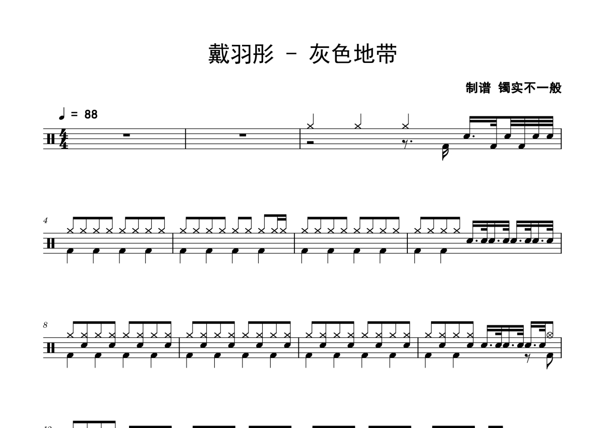 《灰色地带》是戴羽彤演唱的一首歌曲,拍号为4/4拍,歌曲速度为每分钟88拍,这份鼓谱共有三张高清图谱,图谱由 @老虎不说谎 编配上传,图谱使用五线谱编配,使用这份灰色地带架子鼓谱,你将能够轻松地敲打出这首戴羽彤的灰色地带,快来尝试吧。