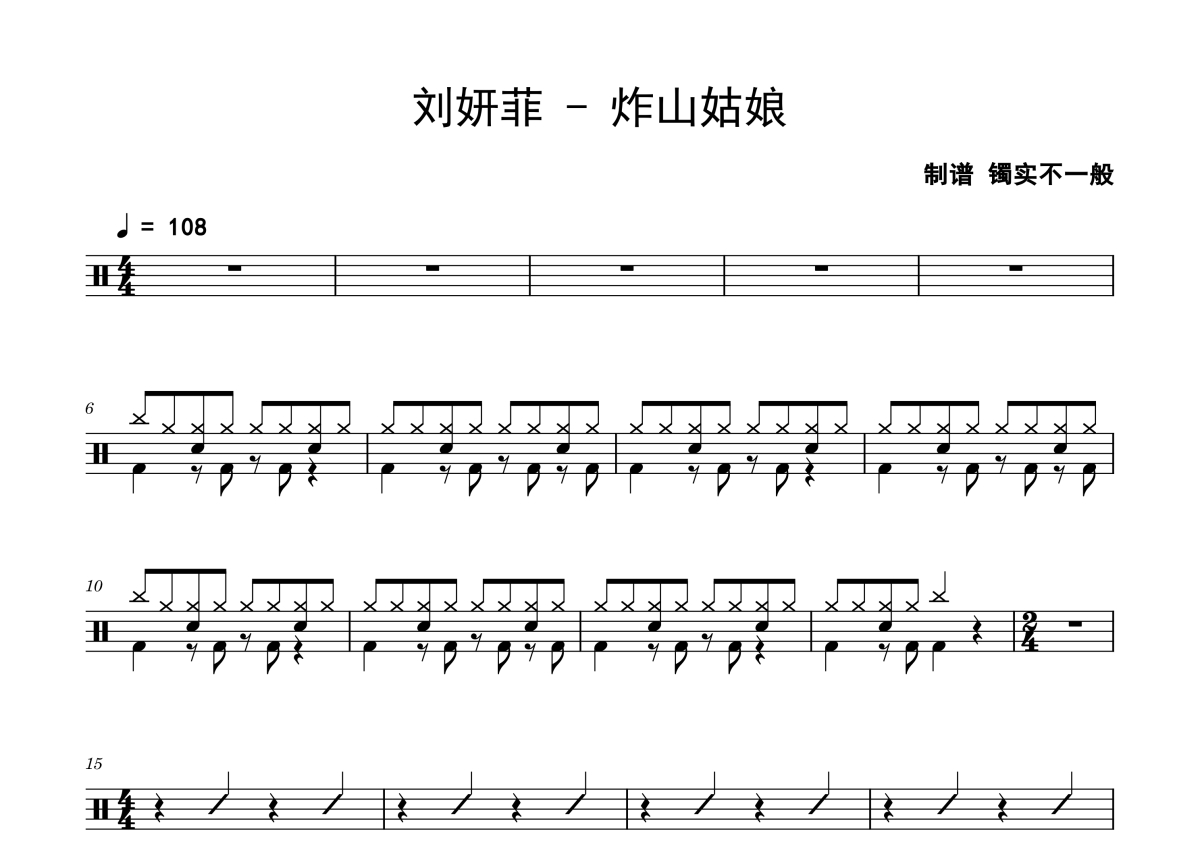 《炸山姑娘》是刘妍菲演唱的一首歌曲,拍号为4/4拍,歌曲速度为每分钟108拍,这份鼓谱共有两张高清图谱,图谱由 @老虎不说谎 编配上传,图谱使用五线谱编配,使用这份炸山姑娘架子鼓谱,你将能够轻松地敲打出这首刘妍菲的炸山姑娘,快来尝试吧。