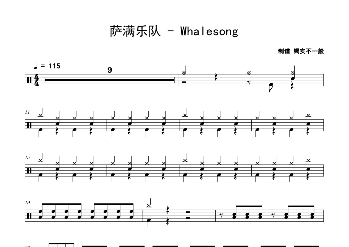 《Whalesong》是萨满乐队演唱的一首歌曲,拍号为4/4拍,歌曲速度为每分钟115拍,这份鼓谱共有两张高清图谱,图谱由 @老虎不说谎 编配上传,图谱使用五线谱编配,使用这份Whalesong架子鼓谱,你将能够轻松地敲打出这首萨满乐队的Whalesong,快来尝试吧。
