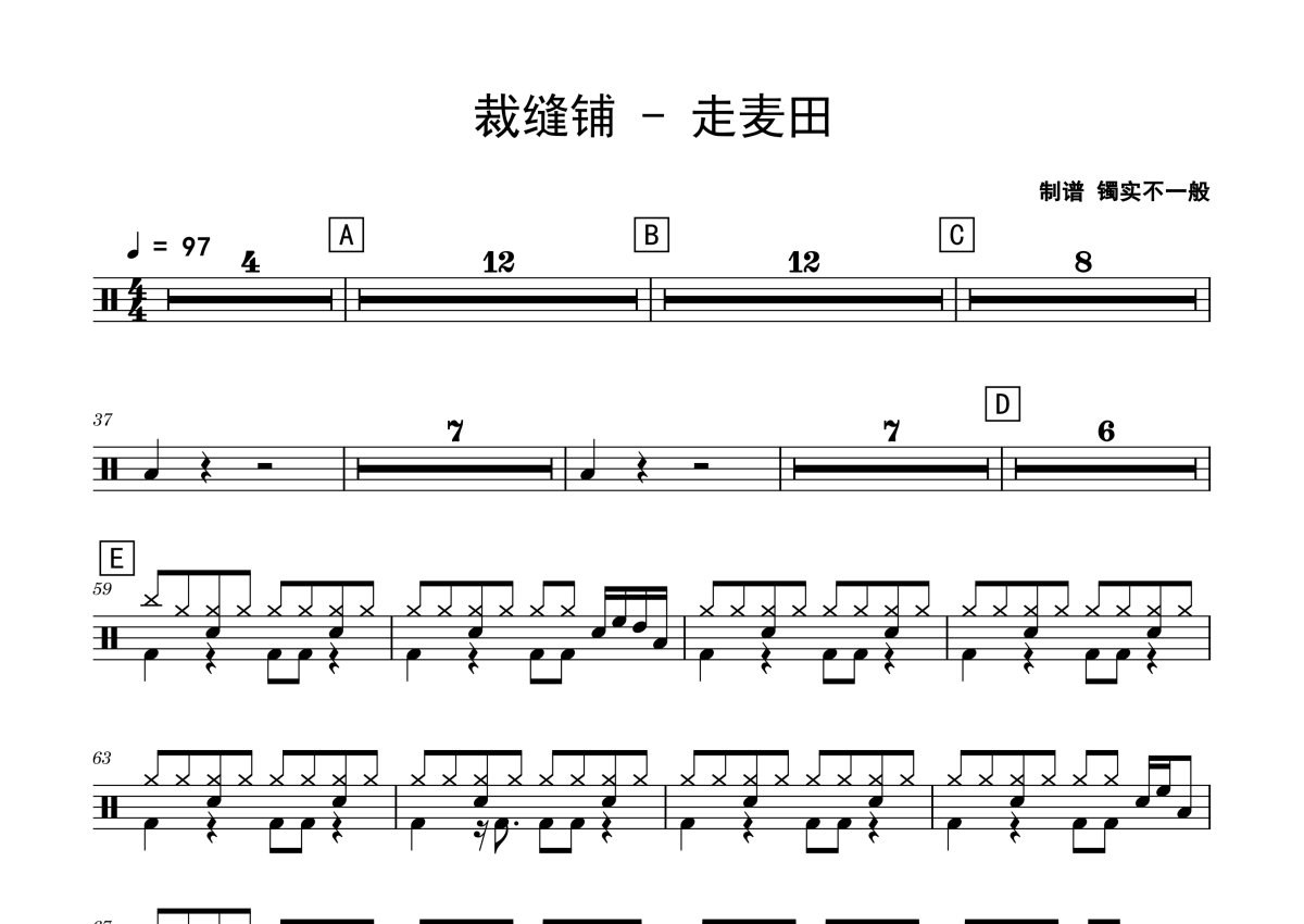 《走麦田》是裁缝铺演唱的一首歌曲,拍号为4/4拍,歌曲速度为每分钟97拍,这份鼓谱共有两张高清图谱,图谱由 @老虎不说谎 编配上传,图谱使用五线谱编配,使用这份走麦田架子鼓谱,你将能够轻松地敲打出这首裁缝铺的走麦田,快来尝试吧。
