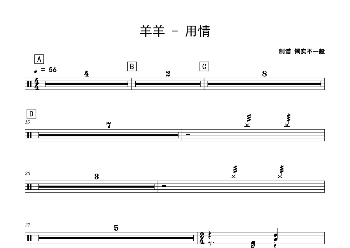 《用情》是羊羊演唱的一首歌曲,拍号为4/4拍,歌曲速度为每分钟56拍,这份鼓谱共有一张高清图谱,图谱由 @老虎不说谎 编配上传,图谱使用五线谱编配,使用这份用情架子鼓谱,你将能够轻松地敲打出这首羊羊的用情,快来尝试吧。