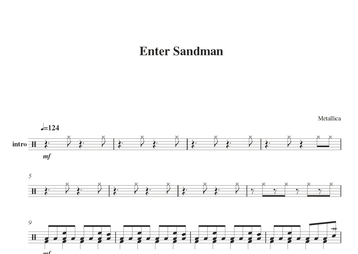 《Enter sandman》是Metallica演唱的一首歌曲,这份鼓谱共有四张高清图谱,图谱由 @打鼓谱 编配上传,图谱使用五线谱编配,使用这份Enter sandman架子鼓谱,你将能够轻松地敲打出这首Metallica的Enter sandman,快来尝试吧。“ Enter Sandman ”是美国重金属乐队Metallica的歌曲。这是他们1991年发行的第五张同名专辑的开场曲目和主打单曲。音乐由Kirk Hammett,James Hetfield和Lars Ulrich创作。吉他手和节奏吉他手Hetfield撰写了歌词,涉及儿童噩梦的概念。