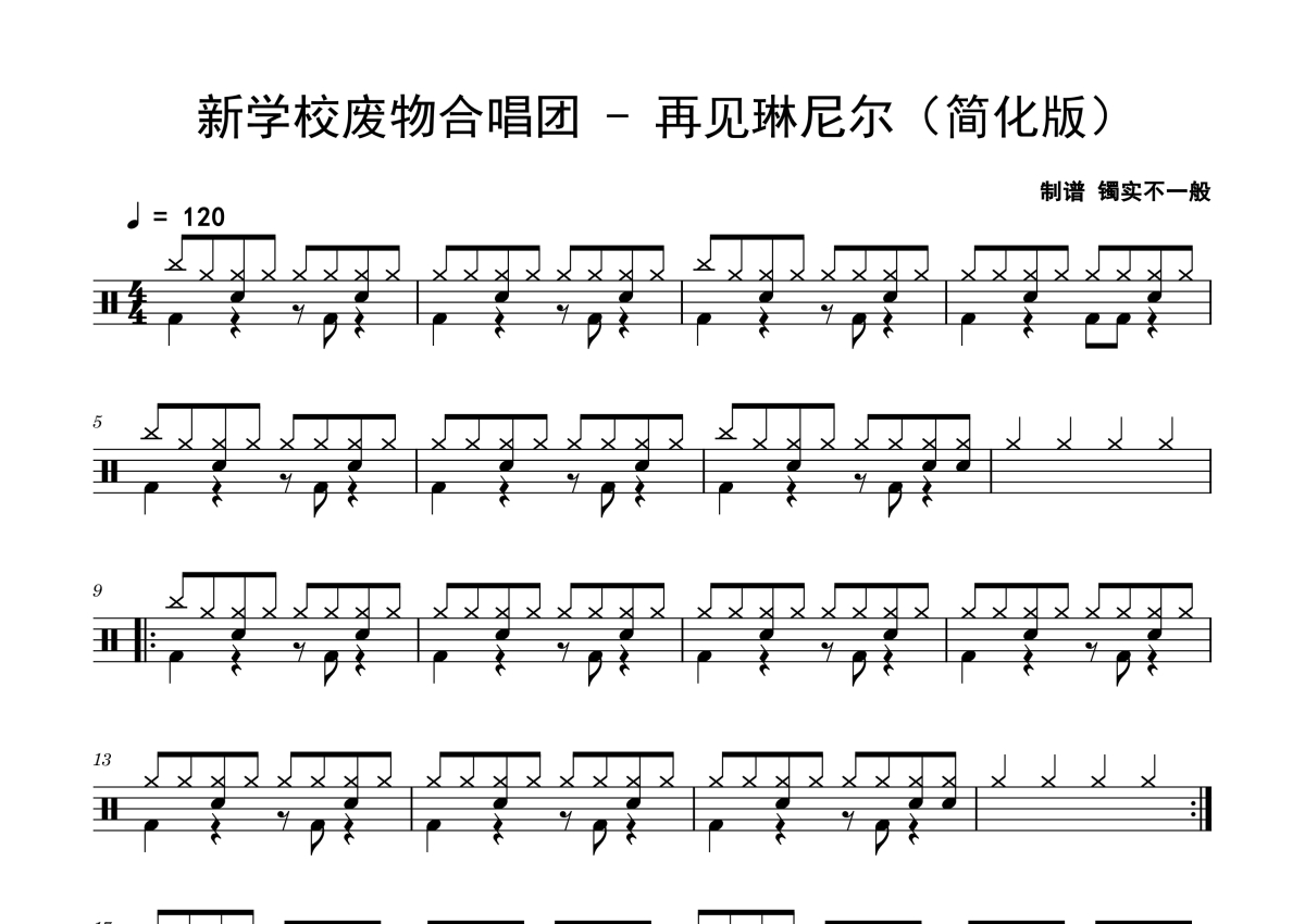 新学校废物合唱团《再见琳尼尔》鼓谱 - 架子鼓谱 - 简化版