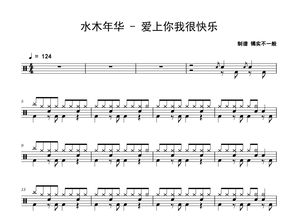 《爱上你我很快乐》是水木年华演唱的一首歌曲,拍号为4/4拍,歌曲速度为每分钟124拍,这份鼓谱共有四张高清图谱,图谱由 @老虎不说谎 编配上传,图谱使用五线谱编配,使用这份爱上你我很快乐架子鼓谱,你将能够轻松地敲打出这首水木年华的爱上你我很快乐,快来尝试吧。