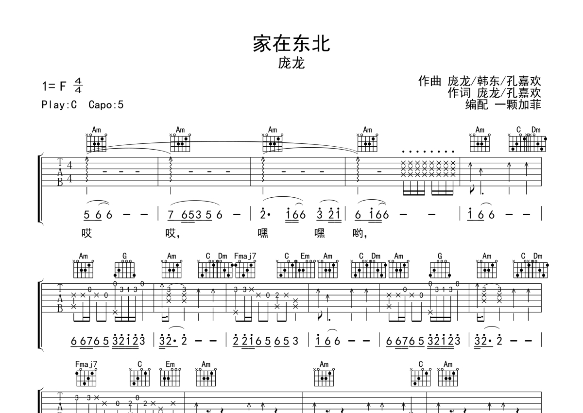 庞龙《家在东北》吉他谱 - C调弹唱六线谱