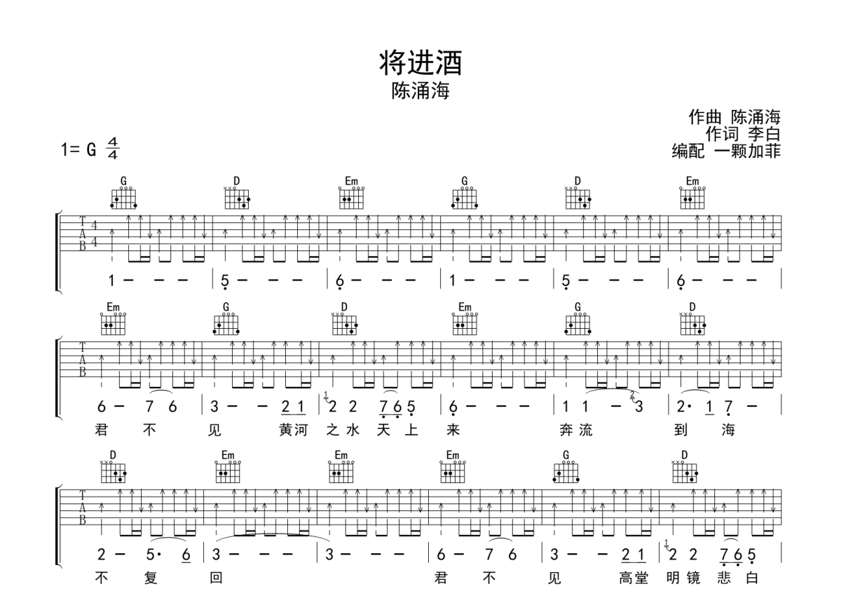 陈涌海《将进酒》吉他谱 - G调弹唱六线谱